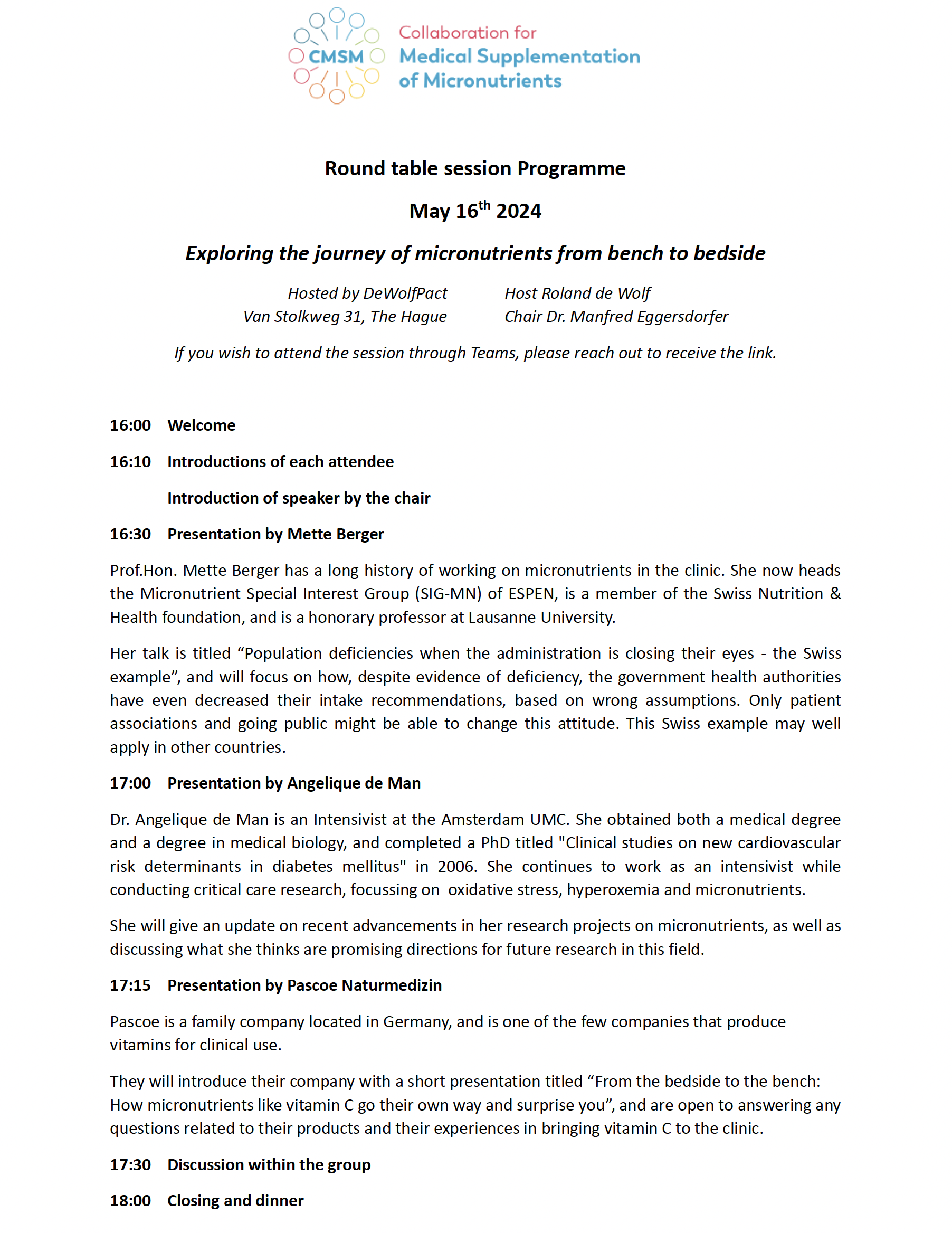 We are very excited for the upcoming round table session, which will take place on May 16th. This session will explore the difficult journey of micronutrients from 'bench to bedside'.